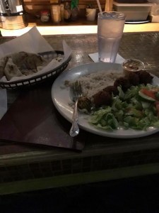 I kicked off my evening with a Moscow mule as seen in the image above and a delicious plate of falafel – a Mediterranean dish. I had never had falafel outside of a pita or tortilla roll but this dish had the bread to the side with all the ingredients – cucumber, lettuce, rice, – on the plate. I have one word: Yum-mmmmy!