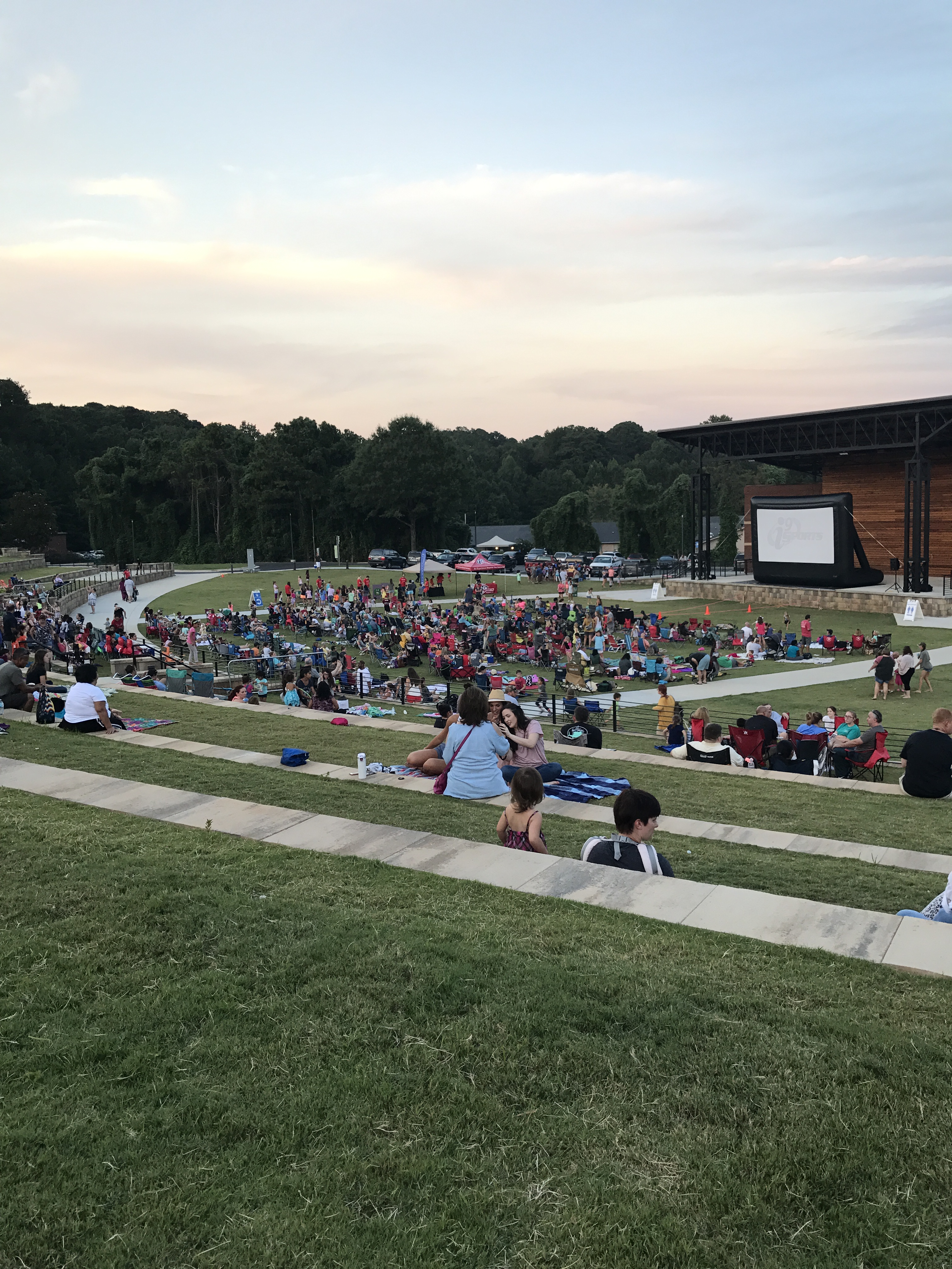 Anyway, one nifty little place that I visited this weekend was Movie Night in the park in Woodstock, Georgia. This is sponsored by Georgia Movies in the Park and they have been doing free movies on the green for quite a few years now. The movie they were playing for the evening was Beauty and the Beast. I admit that I wasn’t there for the movie. I was enticed by the thought of relaxing in the park and enjoying the fresh air for a change.